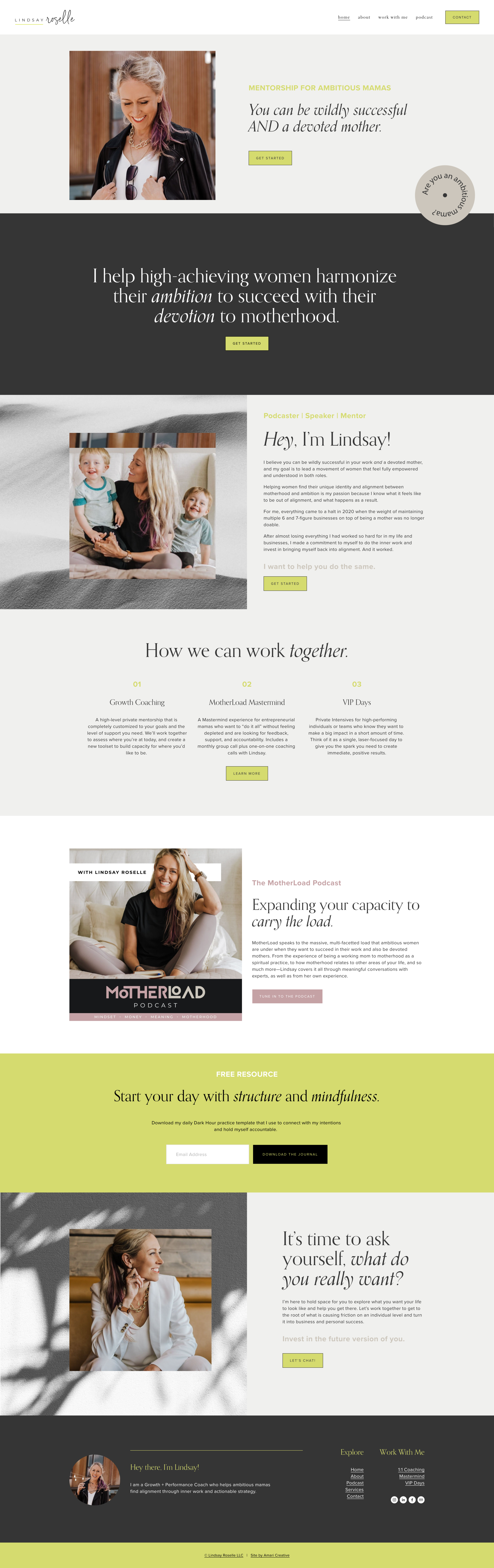 Lindsay Roselle is a Growth + Performance Coach helping entrepreneurial women find alignment between their devotion to motherhood and their ambition to succeed in business. We worked with Lindsay to build a website that is professional and approachable with honest and engaging copy, and a bold and modern logo to be the face of her podcast, MotherLoad.